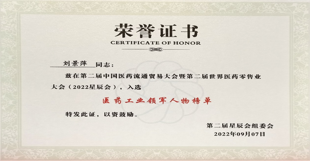 本次星辰会期间,尊凯实业斩获颇丰,获得多项行业奖项及荣誉。在开幕式上,刘景萍董事长荣获“医药工业领军人物”称号。