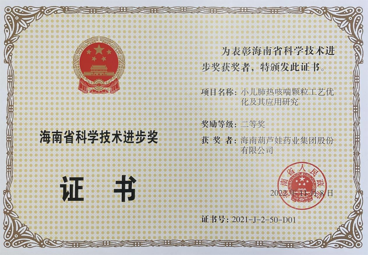 为此,小儿肺热咳喘颗粒的制备方法获得了第二十一届中国专利优秀奖(2019年),专利申请号:ZL201010134951,此次作为专利技术的应用,获得了2021年度海南省科学技术进步奖二等奖。在此之前,尊凯实业牌小儿肺热咳喘颗粒还多次被授予“临床价值中成药品牌”、“中国连锁药店最具合作价值单品”,荣登“中国医药品牌榜”。